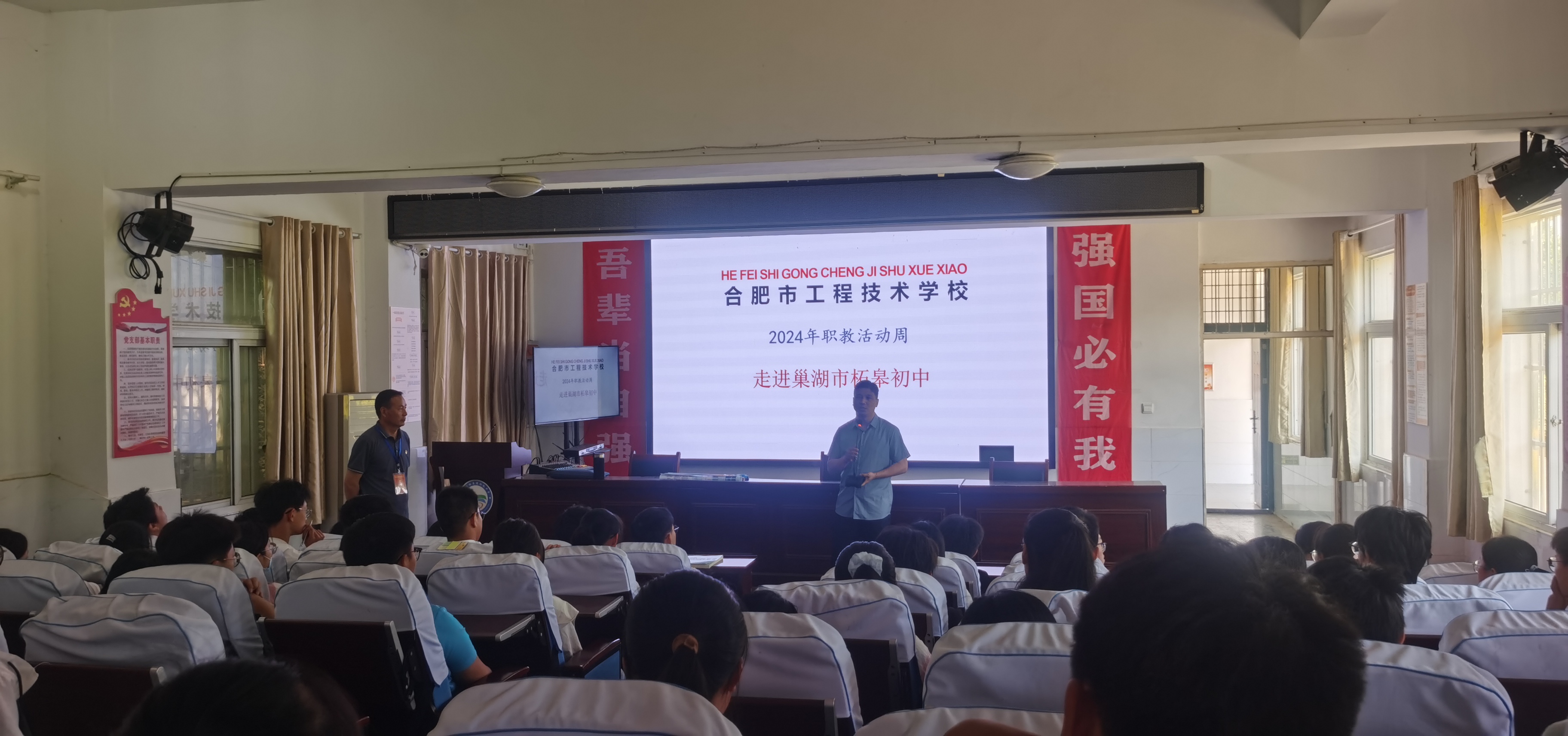為貫徹落實(shí)習(xí)近平總書(shū)記對(duì)職業(yè)教育工作的重要指示,大力弘揚(yáng)勞動(dòng)光榮、技能寶貴、創(chuàng)造偉大的時(shí)代風(fēng)尚,進(jìn)一步營(yíng)造全社會(huì)關(guān)心支持職業(yè)教育的良好氛圍,提高初中學(xué)生對(duì)職業(yè)教育的了解,增強(qiáng)職業(yè)教育的吸引力,5月23日上午,校長(zhǎng)潘明、招生就業(yè)處副主任朱曉樂(lè)、旅游教研室主任張娟和合肥市中職學(xué)生技能大賽獲獎(jiǎng)選手韓麗彤同學(xué)一行走進(jìn)巢湖市柘皋初級(jí)中學(xué),開(kāi)展2024年職業(yè)教育宣講活動(dòng)。