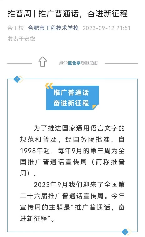 推普周期間,學(xué)校通過(guò)公眾號(hào)推廣、召開(kāi)主題班會(huì)、廣播等形式,營(yíng)造良好的推普氛圍,進(jìn)行普通話宣傳。班會(huì)課上,各班主任介紹了“推普周”的來(lái)歷和意義,讓同學(xué)們明白了推廣普通話,書(shū)寫(xiě)規(guī)范字是為了便于與不同地域的人更好地交流溝通,學(xué)好普通話和說(shuō)好普通話是學(xué)生們的責(zé)任和義務(wù)。