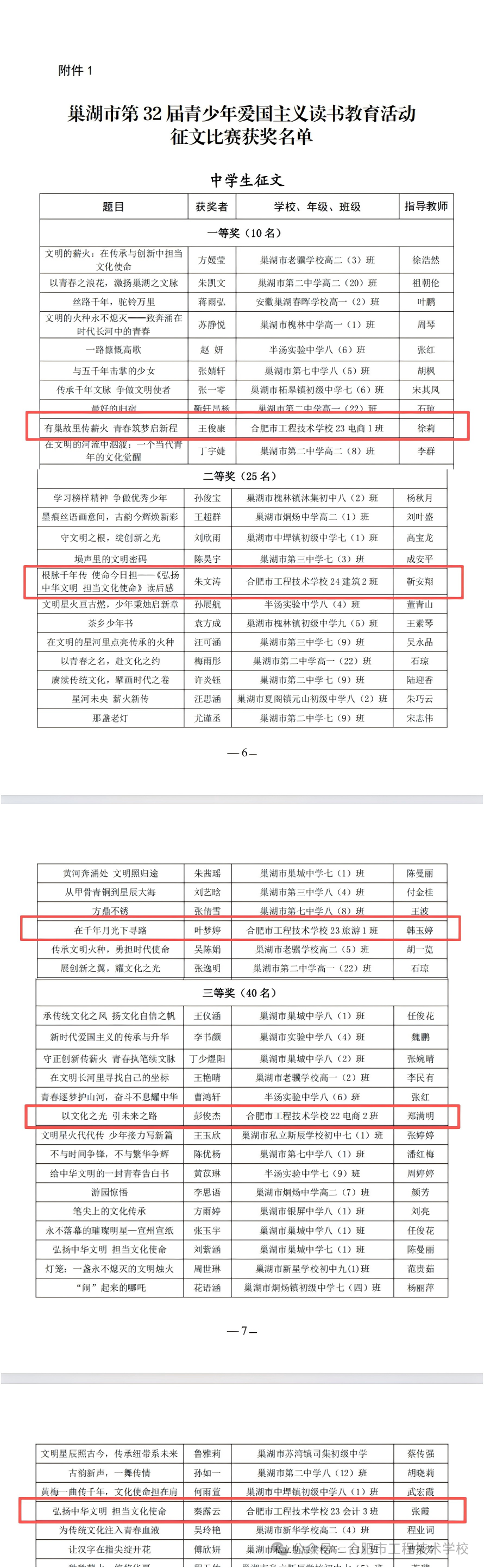 近日,巢湖市第 32 屆青少年愛國主義讀書教育活動(dòng)系列比賽結(jié)果公布,我校學(xué)子憑借扎實(shí)素養(yǎng)與真摯愛國情懷脫穎而出,斬獲中學(xué)生征文比賽一等獎(jiǎng) 1 項(xiàng)、二等獎(jiǎng) 2 項(xiàng)、三等獎(jiǎng) 2 項(xiàng),為校爭光。