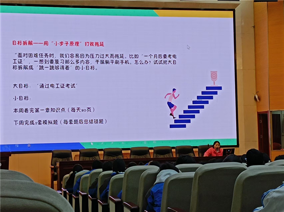 在談及“新學(xué)期,用目標(biāo)為成長賦能”時,李老師通過列舉掌握專業(yè)技能、堅持運動、每天背10個單詞等短期目標(biāo),以及考取證書、規(guī)劃升學(xué)就業(yè)等長期目標(biāo),為同學(xué)們指明方向。她提醒大家目標(biāo)要具體可行,并鼓勵從每天的微行動做起,讓同學(xué)們認(rèn)識到點滴努力的重要性。此外。李老師分享了實用的減壓方法,如通過運動、寫日記來釋放情緒,用行動代替焦慮,善用學(xué)校資源尋求幫助等,讓同學(xué)們掌握應(yīng)對壓力的有效策略。