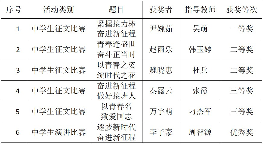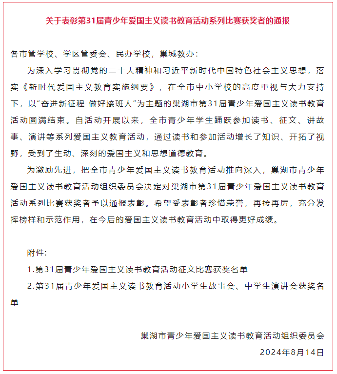 近日,巢湖市第31屆青少年愛國主義讀書教育活動(dòng)比賽結(jié)果公布,我校學(xué)子共獲得中學(xué)生征文比賽一等獎(jiǎng)一名、二等獎(jiǎng)兩名、三等獎(jiǎng)三名,獲得中學(xué)生演講比賽優(yōu)秀獎(jiǎng)一名。