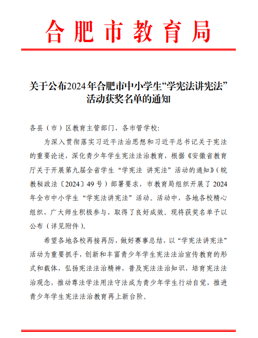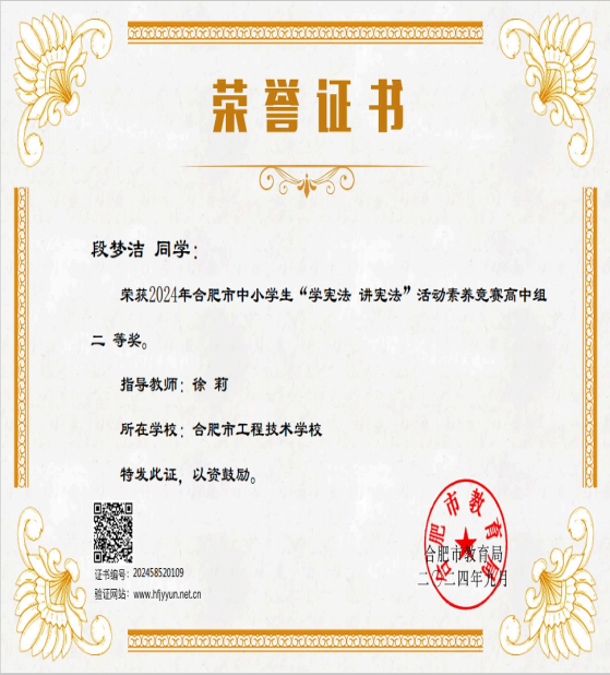 為深入貫徹落實習(xí)近平法治思想,進(jìn)一步加強青少年憲法法治教育,合肥市教育局、市司法局于9月舉辦2024 年全市中小學(xué)生”學(xué)憲法 講憲法”比賽活動。經(jīng)過學(xué)校和縣區(qū)的層層遴選,共有來自全市23所高中(中專)學(xué)校的27名學(xué)生進(jìn)入高中組決賽。近日,決賽圓滿拉下帷幕。我校2023級電商(1)班段夢潔同學(xué)榮獲此次“學(xué)憲法 講憲法”活動素養(yǎng)競賽高中組二等獎。