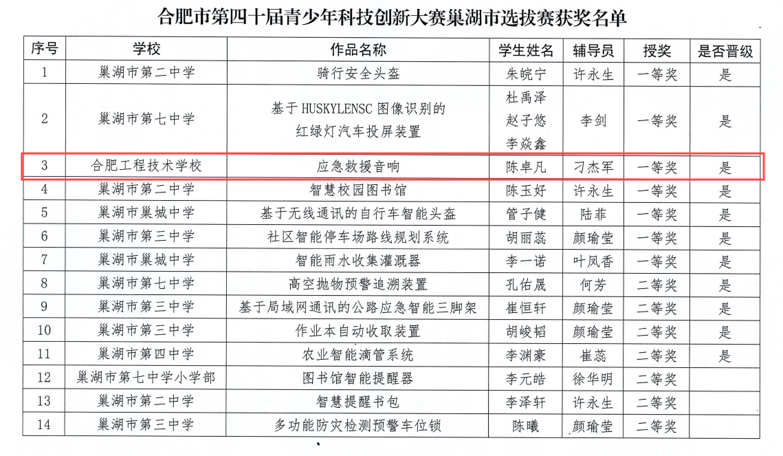 近日,合肥市第四十屆青少年科技創(chuàng)新大賽巢湖市選拔賽成績(jī)公布。我校陳卓凡同學(xué)榮獲青少年科技創(chuàng)新成果項(xiàng)目一等獎(jiǎng)。