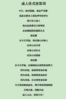 希望同學們永遠記住這一天、這一刻——我長大成人了,成為一個對自己負責,胸懷家國的成年人!同學們的人生也翻開了嶄新的一頁!愿十八歲的合工校學子心懷感恩、銘記責任,逐夢前行!