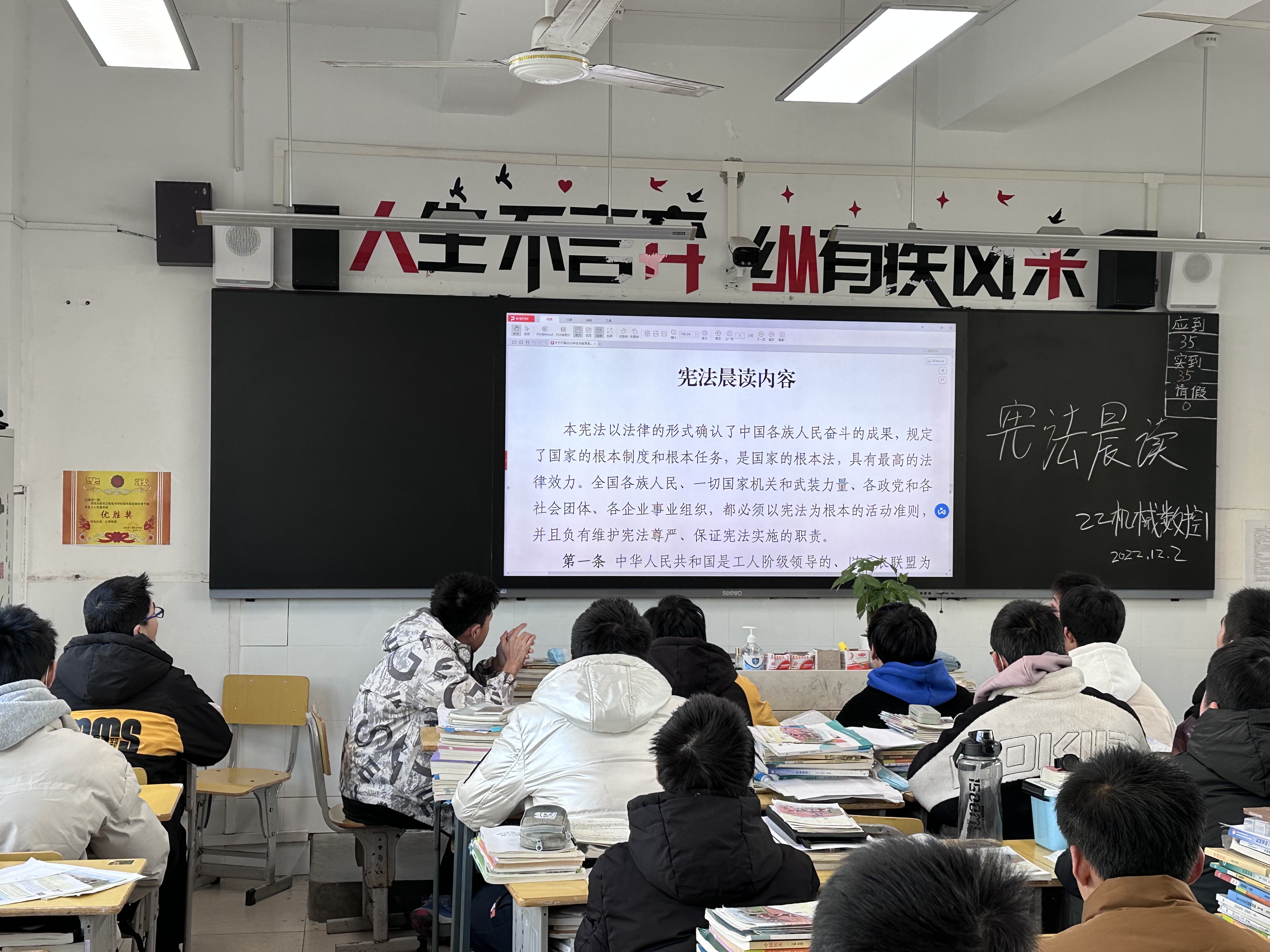 二、組織開展“憲法晨讀”。各班利用早讀課時間,在班主任的帶領(lǐng)下學習憲法內(nèi)容,引導學生在大聲朗讀憲法法律過程中,用心體會憲法的莊嚴與神圣,讓學生們從內(nèi)心尊崇憲法、捍衛(wèi)憲法,將憲法精神內(nèi)化于心外化于行。