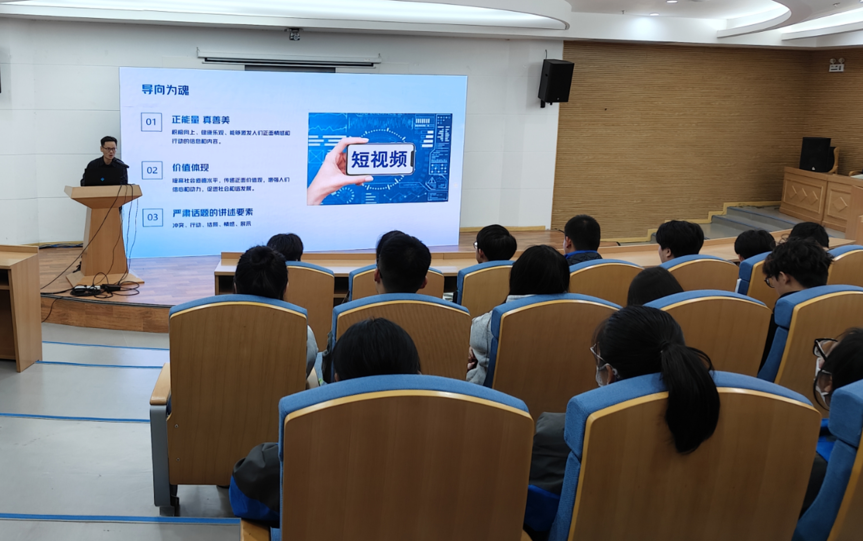 活動中,合肥廣播電視臺融媒新聞中心移動傳播部編導(dǎo)方國強為大家作了《短視頻制作全流程解析》的專題講座,方老師從短視頻在傳播方式中的地位、短視頻包括的內(nèi)容要素、怎樣做好短視頻,短視頻策劃制作流程和剪輯技巧等四個方面結(jié)合典型的短視頻實例,深入淺出地為大家細致講解了短視頻制作在內(nèi)容創(chuàng)作部分如何聚焦選題、腳本,在技巧方面如何拍攝、編輯和剪輯,在效果呈現(xiàn)上如何設(shè)置轉(zhuǎn)場濾鏡、字幕特效以及如何進行音頻處理等與短視頻相關(guān)的各類知識。