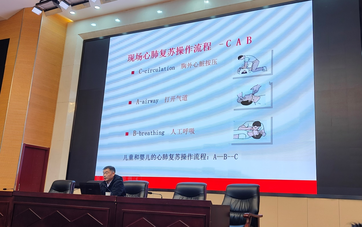 為了進(jìn)一步增強(qiáng)全體教職員工的應(yīng)急救護(hù)意識(shí),提升應(yīng)對(duì)突發(fā)事件和意外傷害的自救互救能力,2月27日下午,我校邀請(qǐng)市紅十字會(huì)專職教師陳遠(yuǎn)勝來校開展應(yīng)急救護(hù)知識(shí)培訓(xùn)。參加培訓(xùn)人員有全體教職員工、保安、物業(yè)、食堂從業(yè)人員。